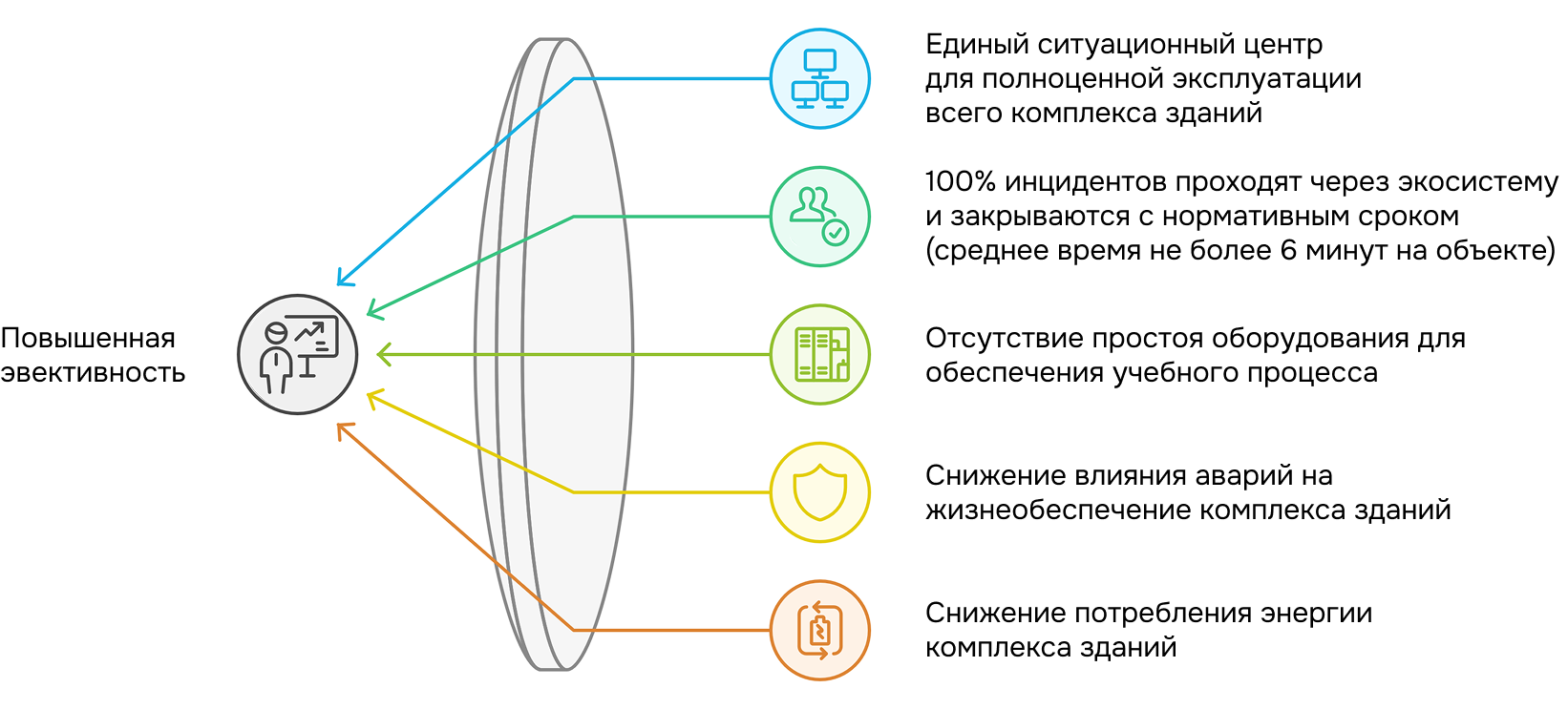 С применением цифровых технологий процесс эксплуатации стал намного проще. Можно оперативно контролировать техническое состояние зданий Университета, и крайне важно, сокращать время простоя критического оборудования для обеспечения основного процесса обучения.